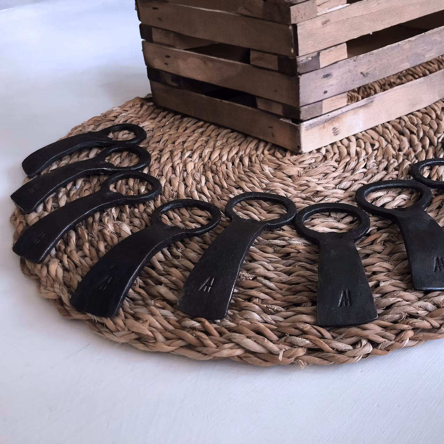 Enkel handsmidd kapsylöppnare som är svart efter linoljebränning.